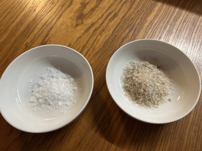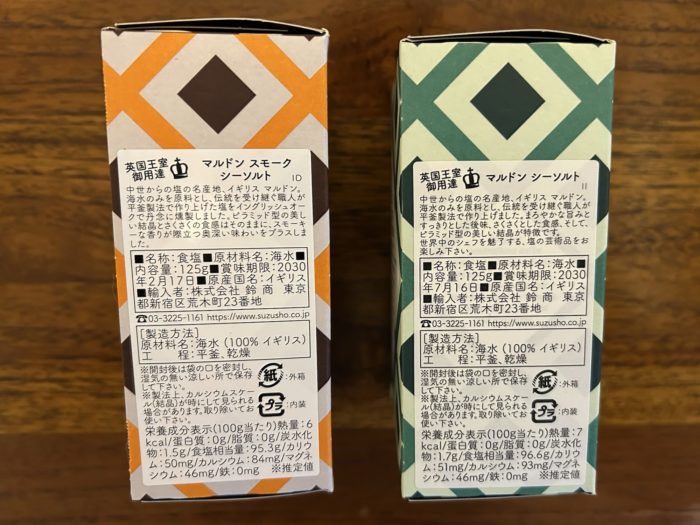 開けてみるとプレーンはいわゆる普通の塩の色、スモークは燻しているためか茶色がかった琥珀色です。